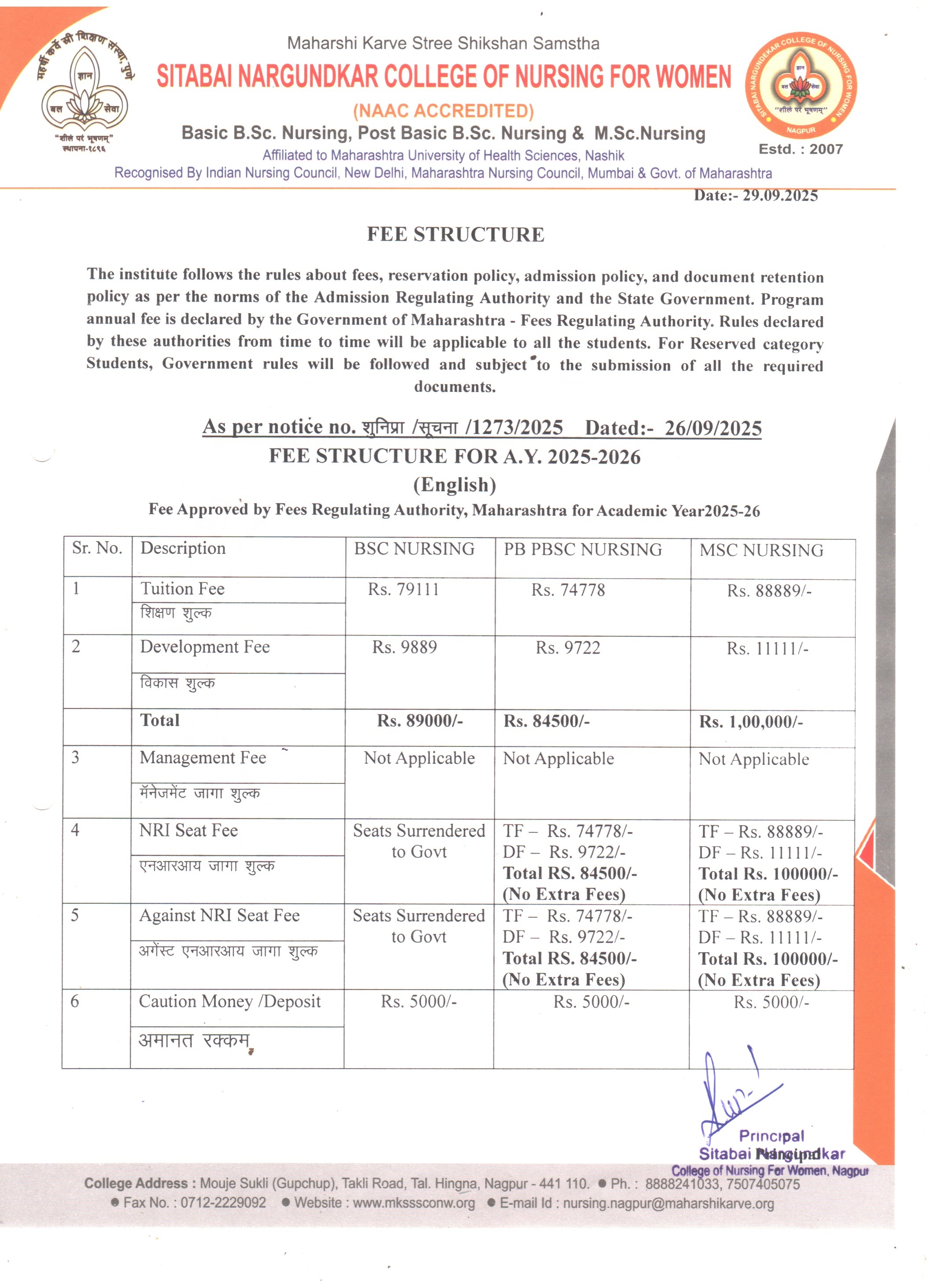 Sr. No. Programme DEMAND DRAFT SHOULD BE IN FAVOUR OFF 1 B.Sc Nursing COLLEGE OF NURSING FOR WOMEN, NAGPUR 2 PB BSC Nursing SITABAI NARGUNDKAR COLLEGE OF NURSING FOR WOMEN, NAGPUR 3 M.SC Nursing SITABAI NARGUNDKAR COLLEGE OF NURSING FOR WOMEN-MSC